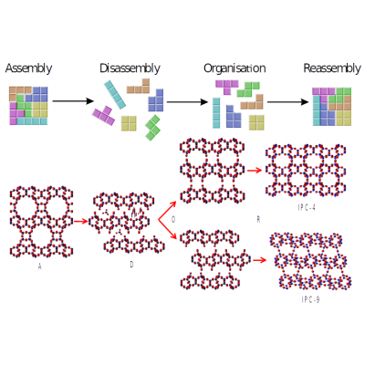 Figure 1 The ADOR process. The top panel shows a schematic of the process, which involves the Assembly of a parent, followed by Disassembly into its constituents, before Organising the constituents into a new relative orientation before final Reassembly into a new structure. The lower panel shows how this concept can be applied to zeolites. Assembling a parent, before disassembly into layered building blocks. The next step is then to organise these layers with respect to each other before the final reassembly into new materials. Different organisations lead to the different possible final zeolites. In this project we will study the disassembly step in detail to understand the atomistic mechanism.